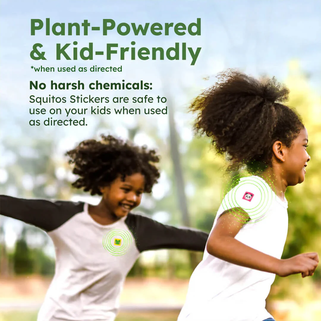 Squito Stickers are infused with all-natural Citronella Oil. This safe* and effective repellent can help keep mosquitos away. It’s all thanks to the unique “nano-capsule” technology, which slowly releases powerful Citronella vapors for long-lasting mosquito protection*.