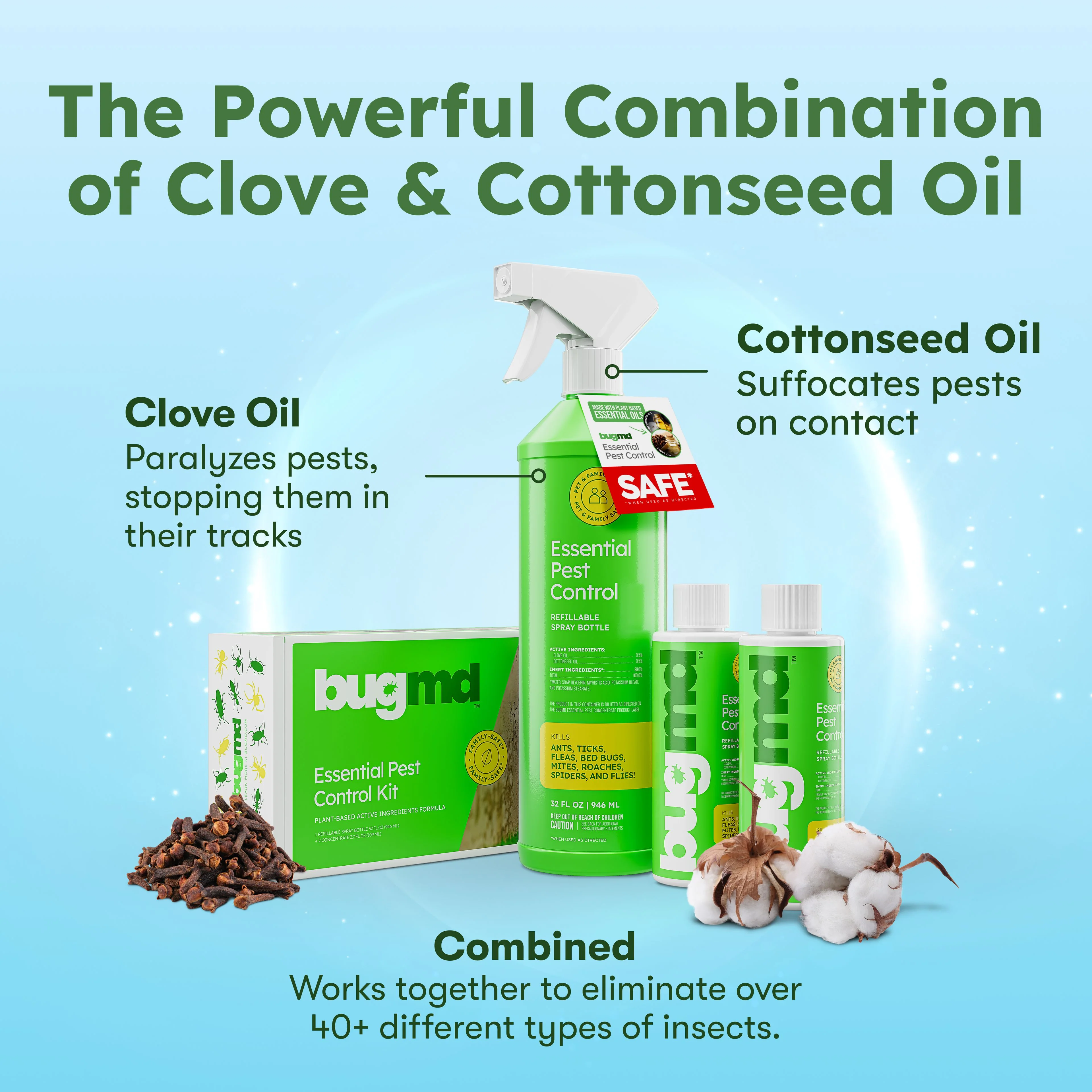 Essential Pest Concentrate is designed to fight ants, roaches, fleas, ticks, bed-bugs, and lots more. Its power comes from two of Mother Nature’s most potent bug-busting essential oils: Clove Oil & Cottonseed Oil. These plant-based active ingredients are why this formula is safe around kids, pets, and plants when used as directed.