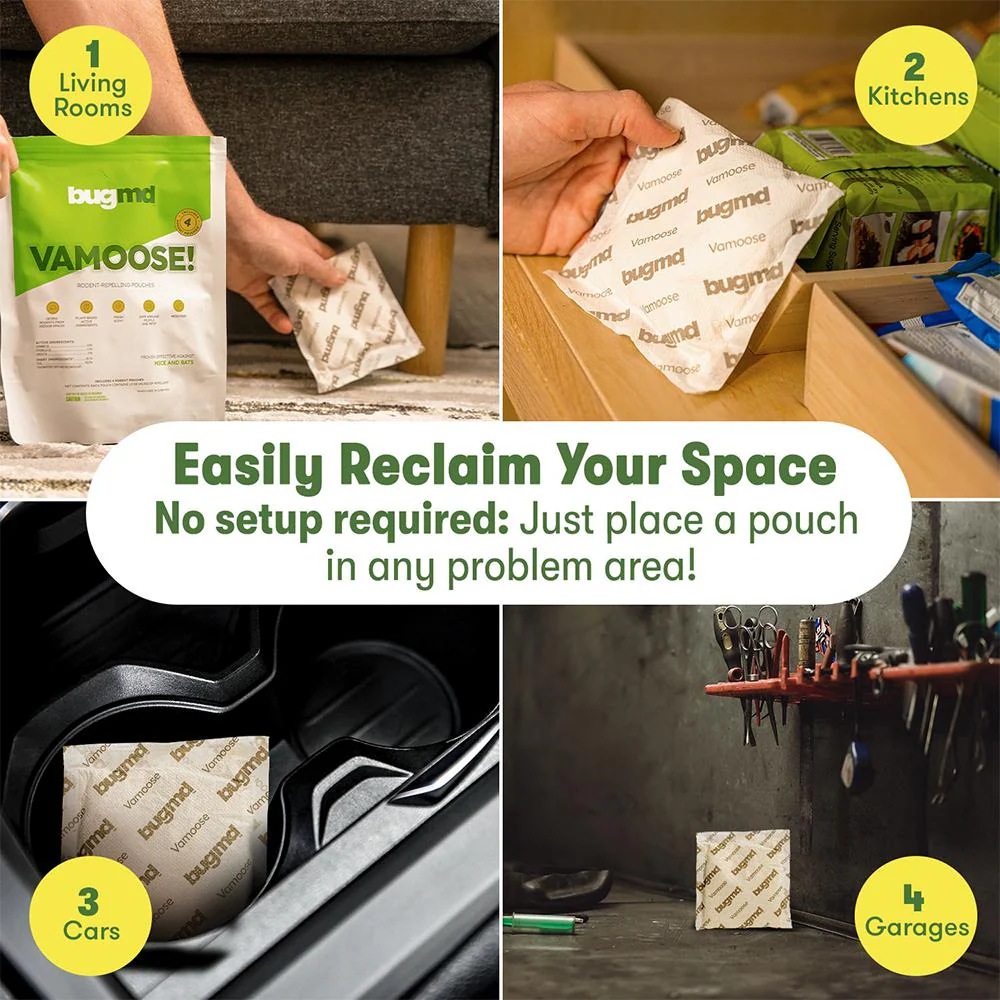 Keep mice, rats, and other pesky rodents far away with Vamoose! These convenient pouches are infused with 3 potent essential oils: Cornmit, Citronella, and Linseed. Simply place one near any problem area to create a powerful “scent barrier” and enjoy the protection you deserve.